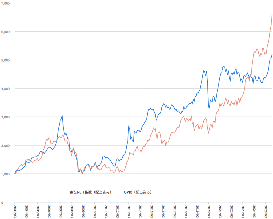 配当金を含まなければ、REITとTOPIXは異なる値動きをしますから、どちらかに偏らず、分散投資を検討した方が良いかもしれません。